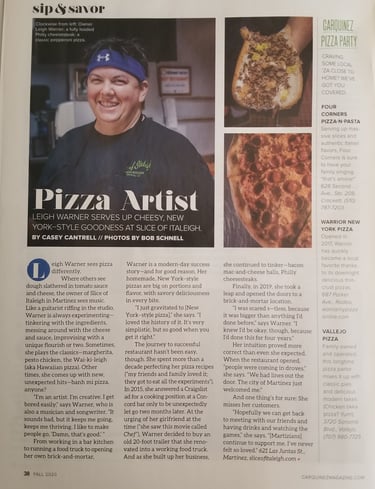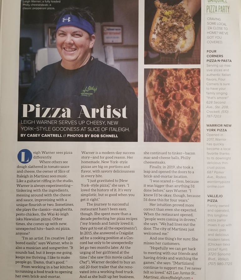 Leigh Warner, chef/owner, has always tried hard to stay creative, fresh, hip (as well as honest) to continue tantalizing people's taste buds and blowing peoples mind's with her innovative pizza and pub style creations for nearly 10 years. She started in the pizza industry as a delivery driver, grew into management, then went onto cooking, under Italian pizzerias & east coast chefs, absorbing and learning everything to eventually start her own business. In 2015, she opened her first kitchen for someone else, then by the suggestion of her then wife, she opened her own food truck (Slice of Italeigh) and 4 years later opened a brick n mortar with great success in downtown Martinez, CA.